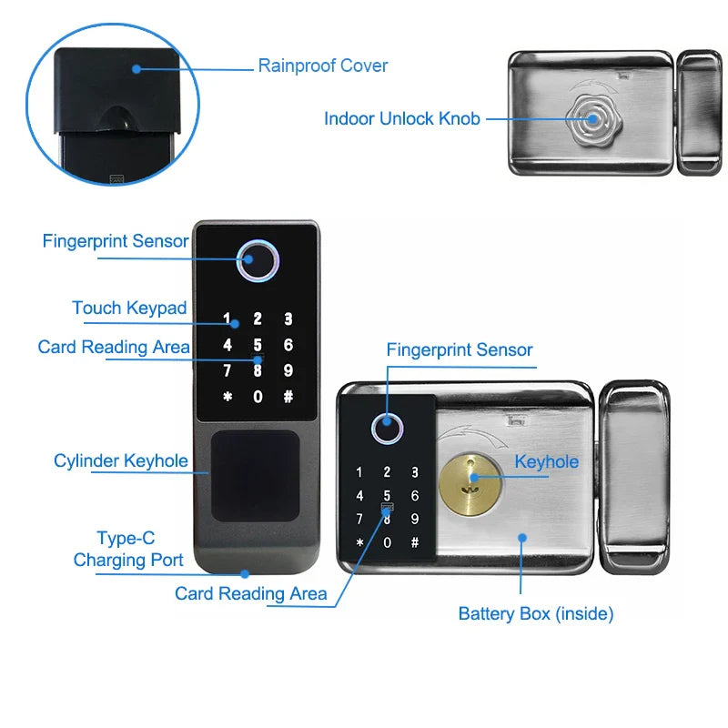 🔑 Multiple Unlock Methods – includes App, Bluetooth, mechanical keys, card, password, WiFi, and fingerprint.