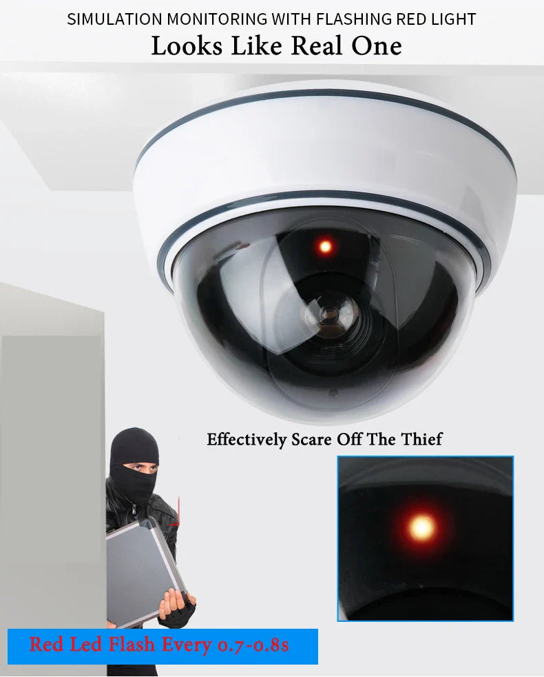 🔴 Flashing LED light – battery-powered, simulating round-the-clock recording.